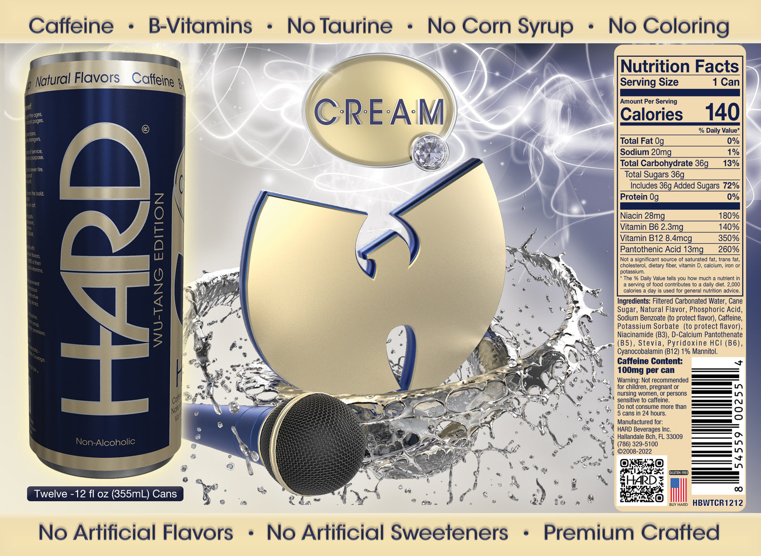 HARD C.R.E.A.M. is crafted with purified filtered water, natural flavors, cane sugar, and stevia. HARD is then enhanced with caffeine and B-vitamins.